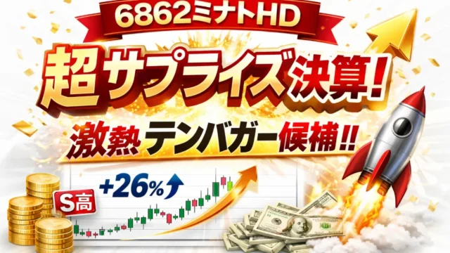 ミナトホールディングス(6862)が2026年3月期第3四半期決算で超サプライズ。売上・営業利益・純利益すべてが過去最高を更新し、通期業績も大幅上方修正。夜間PTSではS高水準まで急騰しました。本記事では決算短信・開示資料をもとに、半導体メモリー市況の追い風、M&A効果、全セグメント黒字化の実態を徹底分析。PER6.7倍・時価総額121億円という異常な割安水準から、テンバガー候補としての投資妙味と今後の目標株価を詳しく解説します。
