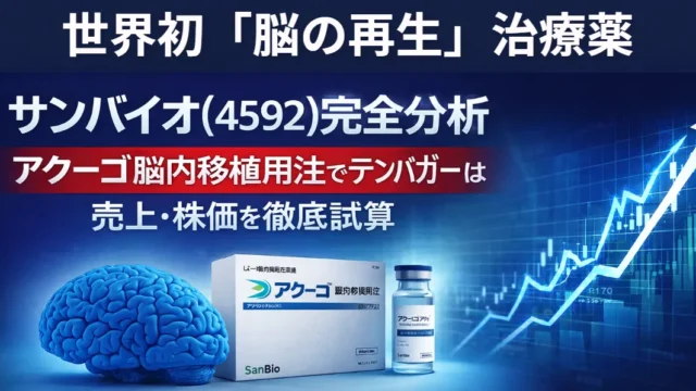 サンバイオ(4592)の将来性を徹底分析。再生医療製品アクーゴの売上ポテンシャルを「薬価×症例数」から具体的に試算し、PSR・DCFベースで適正株価を算出しました。直近決算(2025年12月)の赤字縮小や株価上昇の背景、需給や機関投資家の視点も踏まえ、強気・中立・弱気のシナリオ別に今後の株価レンジを提示。テンバガー候補としての現実性とリスクを、本気の投資家目線で解説します。