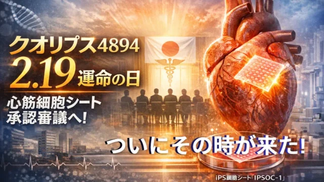 クオリプスの心筋細胞シート「IPSOC-1」「リハート」が、ついに2/19の薬事審議会で製造販売承認の可否を審議されます。再生医療の中でも心不全領域は市場規模が大きく、承認されれば同社の事業構造は一気に変わる可能性があります。本記事では、最新決算のポイント、期ずれによる下方修正の背景、そして承認後にテンバガー候補と見られる理由をわかりやすく整理しました。2/19のイベントを前に、クオリプスの現在地と将来性を丁寧に解説します。