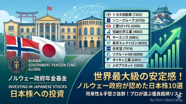 世界最大の政府系ファンド「ノルウェー政府年金基金」が保有する注目の日米株10選を徹底解説!長期視点で「手堅さ」と「将来性」を兼ね備えた銘柄をピックアップしました。世界シェアを誇るトヨタ自動車(7203)やソニーグループ(6758)、高収益体質のキーエンス(6861)や信越化学工業(4063)、半導体関連の東京エレクトロン(8035)に加え、金融大手の三菱UFJ FG(8306)、娯楽インフラの任天堂(7974)、グローバル展開を加速するリクルートHD(6098)、環境技術のダイキン工業(6367)を紹介。さらに、直近でノルウェー銀行が保有を大幅に増やし話題となったメタプラネット(3350)の動向まで網羅。ESG投資の先駆者が選ぶ「不祥事リスクが低く、持続可能な企業」を知ることは、2026年の資産形成において強力な武器になります。プロの選美眼を味方につけ、上昇基調にある優良株で堅実な投資戦略を立てましょう。