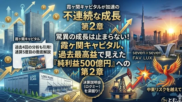 5度目の執筆となる愛着銘柄「霞ヶ関キャピタル(3498)」の最新決算を徹底解説!今回の記事では、ログミーの決算説明会資料を深く読み解き、驚異の「純利益500億円」を掲げた新中期経営計画の衝撃と、不動産開発から投資プラットフォームへ進化した収益構造の凄みを熱く語ります。さらに、多くの投資家が懸念する中東情勢の緊迫化が、同社のドバイ不動産事業に与える影響についても独自視点で分析。過去4回の執筆データと比較し、なぜ今この銘柄が「第2章」の幕開けと言えるのか、その理由を明らかにします。配当2倍、利益2.5倍という圧倒的な有言実行を見せる同社の未来予想図とは?「LOGI FLAG」やホテル事業の爆発力を含め、ホルダー必見の情報を文字数多めで濃密にまとめました。霞ヶ関キャピタルの真の価値を知りたい方は、ぜひ最後までご覧ください!