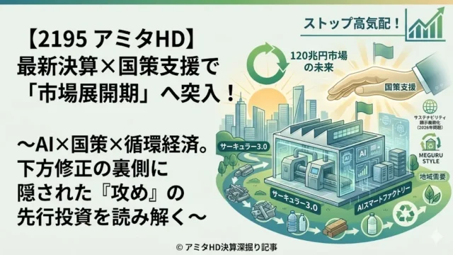 アミタホールディングス(2195)がストップ高!環境省による「リサイクル設備投資への支援策」報道と、2026年3月12日に発表された最新決算資料を徹底分析。2025年度は世界情勢の荒波で下方修正となったものの、その裏側ではAI活用のスマートファクトリー新設など、未来への「攻めの先行投資」が着実に進んでいます。本記事では、サーキュラーエコノミーの本命銘柄として注目される同社の業績推移から、独自戦略「サーキュラー3.0」、さらには「2026年問題」を見据えた今後の見通しまで分かりやすく深掘り解説。単なるリサイクル業者に留まらない、AI×国策×循環経済のハイブリッド戦略とは?「時代がアミタに追いついた」と言われる理由を、13の視点で解き明かします。株価急騰の背景や、投資家が知っておくべき中長期ロードマップを知りたい方は必見の内容です。