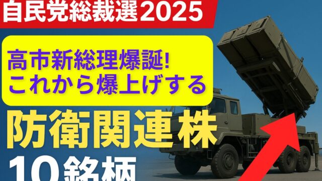 日米株【自民党総裁選2025】高市新総理爆誕で上がる!防衛関連株10銘柄(3重工を除く注目株リスト) 10月4日の自民党総裁選は小泉vs高市の一騎打ち。誰が勝っても防衛関連株は爆上げ必至!すでに高値圏の三菱重工・川崎重工・IHIは外し、これから狙える出遅れ有望株10銘柄を厳選。業績・防衛比率・調達実績を徹底解説した投資家必見の記事です。 2025.09.28 2025.10.09日米株