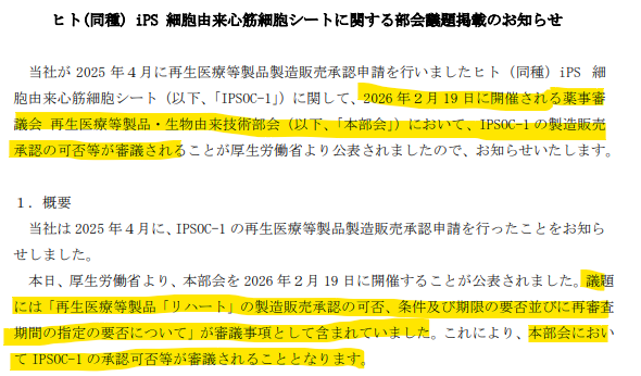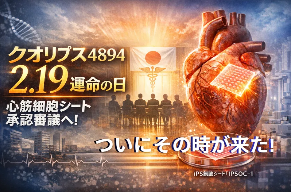 正直に言うと、今回のIRを見た瞬間に胸がざわつきました。 クオリプスが長年積み上げてきた心筋細胞シート「IPSOC-1」。 その製造販売承認の可否が、2月19日の薬事審議会で正式に審議されると発表されたからです。