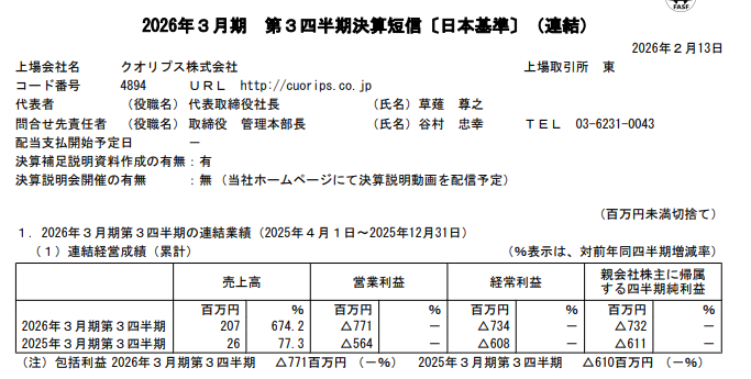 2026.2.13の決算発表と同時に発表されたクオリプスからのIR….