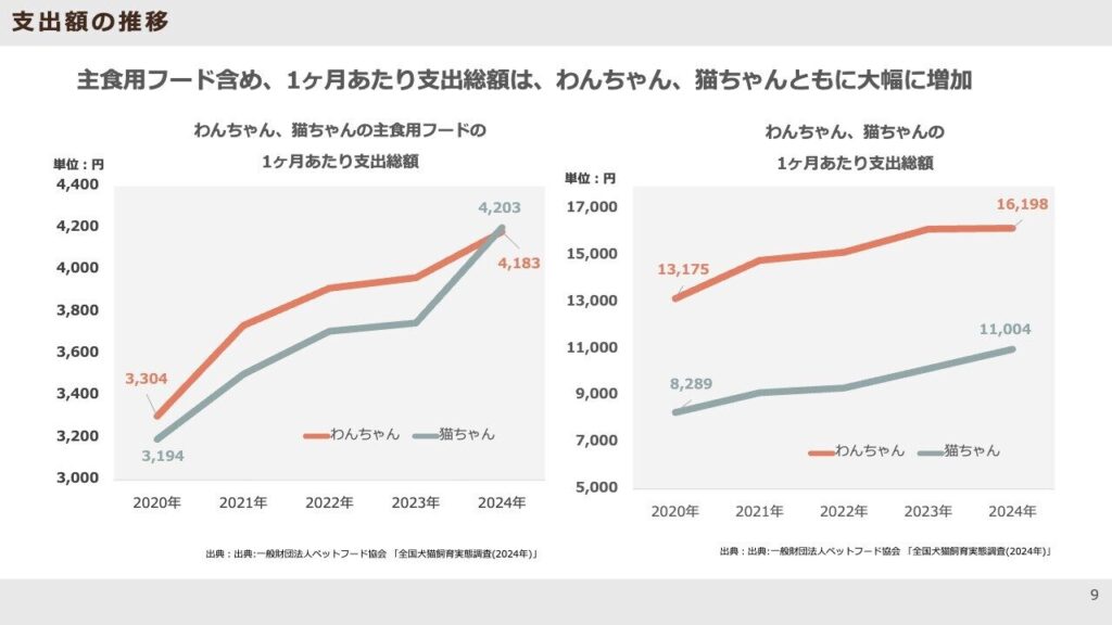 - 市場の追い風: 現在、日本の犬猫の飼育数は横ばいですが、「1頭あたりの年間支出額」は激増しています。「少しでも長く一緒にいたい」という飼い主の切実な願いが、プレミアムフード市場を押し上げています。