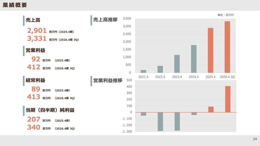 - スモールキャップからのスタート: 上場直後の時価総額はまだ小さく、今後の成長加速によって機関投資家が本格参入してくれば、株価のステージは一気に変わります。