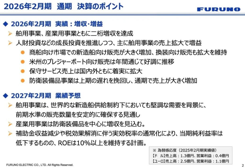 見てください、この営業利益「倍増」の破壊力を。売上の伸びに対して利益の伸びが圧倒的に大きいのは、いわゆる「営業レバレッジ」が強烈に効いている証拠です。部材価格の安定と、高付加価値な最新鋭レーダー、自律航行支援システムの出荷が利益率を劇的に押し上げました。営業利益率10%突破は、メーカーとしてのステージが変わったことを意味します。
