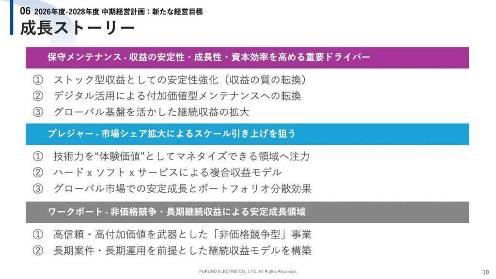 これらは、顧客から月額料金(サブスクリプション)を得るモデルや、メンテナンス・修理による安定収益(ストック収入)を最大化させる戦略です。利益率の向上と、景気変動に左右されにくい経営基盤の構築。この「シン・古野電気」への進化こそが、PER(株価収益率)の評価を一段階引き上げるトリガーとなります。