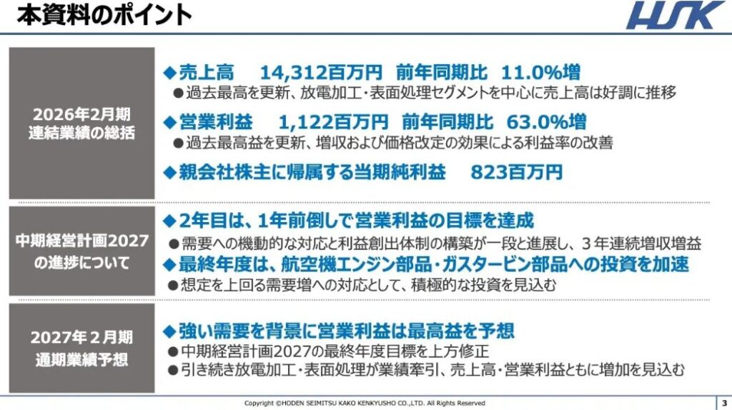 本日は、2026年2月期の通期決算資料およびログミーの書き起こしを徹底的に読み込み、私が今最も「熱い」と感じている銘柄の一つ、放電精密加工研究所(HSK / 6314)について深掘りします。