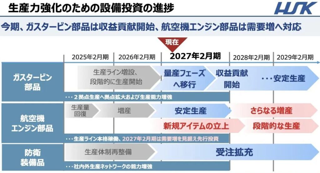 1. 三菱重工業(MHI)との資本業務提携による「実利」単に株を持ってもらっただけではありません。MHIから熟練の技術支援を受け、航空機エンジン部品の生産ラインを最適化。さらに、MHI経由の安定した防衛案件が流れ込むことで、工場の稼働率が極めて高い水準で安定しています。