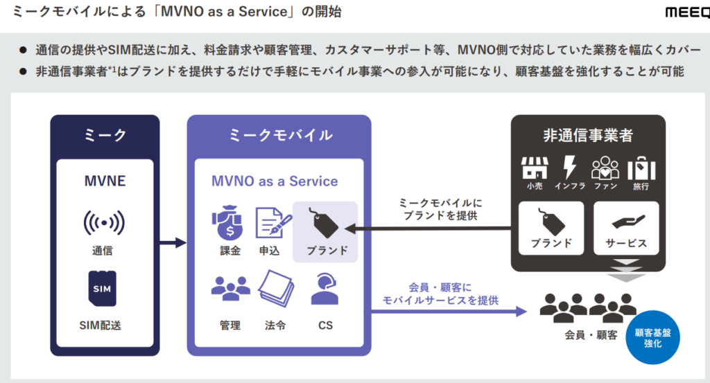 企業は自社ブランドで通信サービスを提供でき、ミークは裏方として収益を積み上げるモデル。
