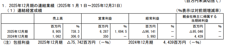 本業(営業)は伸びているものの、期末のビットコイン価格が同社取得単価を下回ったため非現金評価損が計上され、経常・純損失が膨らみました。この点は単なる営業の「失敗」ではなく保有資産(BTC価格)変動の影響が大きいことに注意が必要です。