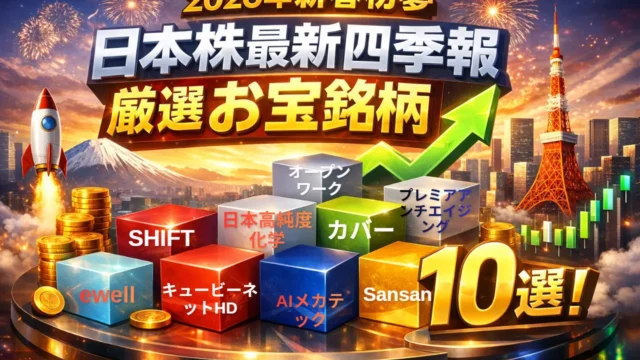 日米株2026年新春初夢・日本株最新四季報厳選お宝銘柄10選 2026年の日本株市場を展望し、新春相場で狙いたい“初夢お宝株”を最新四季報から10銘柄厳選して紹介。NISA資金の流入や1月初旬の買い時メリット、注目テーマ、業績トレンドをわかりやすく解説。成長株・テーマ株・業績相場を総合的に押さえ、2026年の投資スタートダッシュに役立つ保存版ガイド。 2025.12.26 2026.01.03日米株