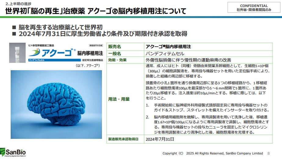 アクーゴは、外傷性脳損傷(慢性期)の運動麻痺改善を目的とした再生医療製品。
