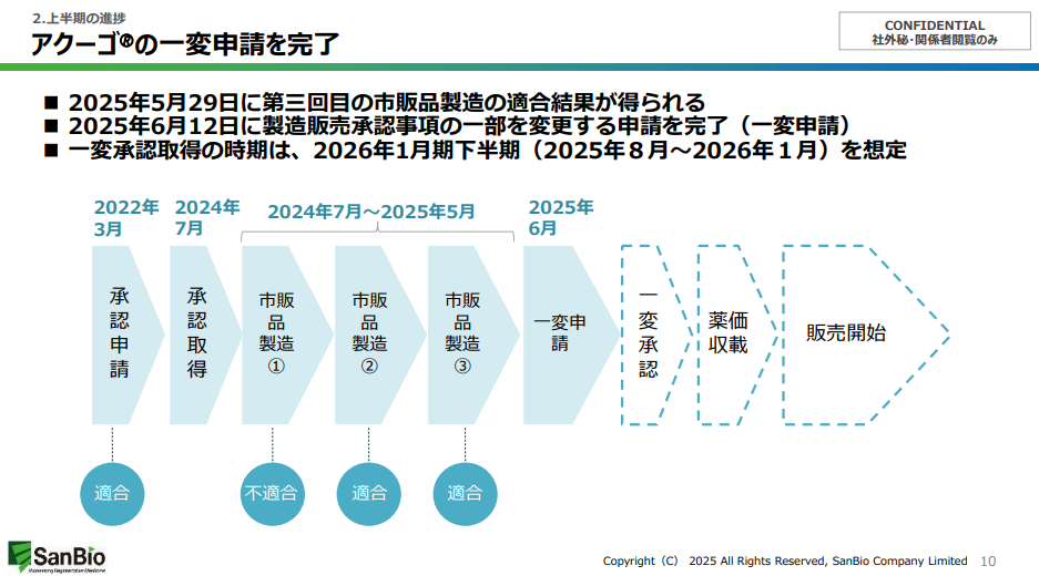 「アクーゴの一変承認取得は2026年1月期下半期(2025年8月〜2026年1月)を想定」