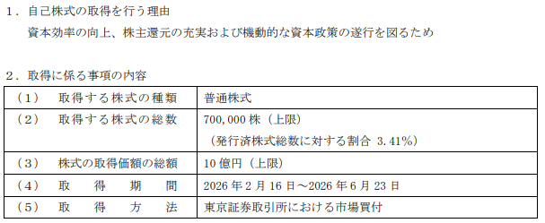 今回の自社株買いは、発行済株式の 3.41% に相当するインパクトのある規模。