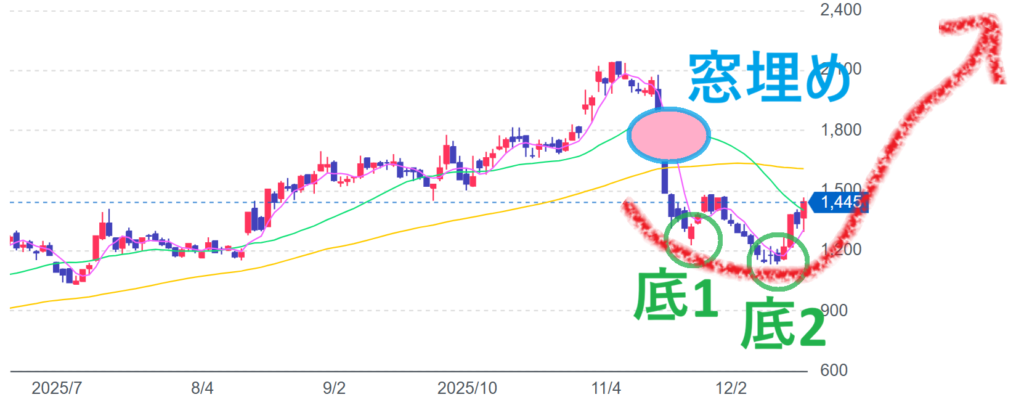 添付チャートをご覧ください。 11月急落時に形成された“窓”。現在の株価はこの窓を明確に意識しながら切り返してきています。