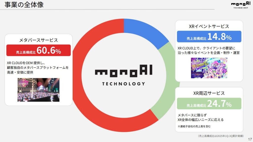 モノAIは、XR(VR・AR・MR)やメタバース、デジタルツイン技術を活用したソリューション提供を主力とするテクノロジー企業です。