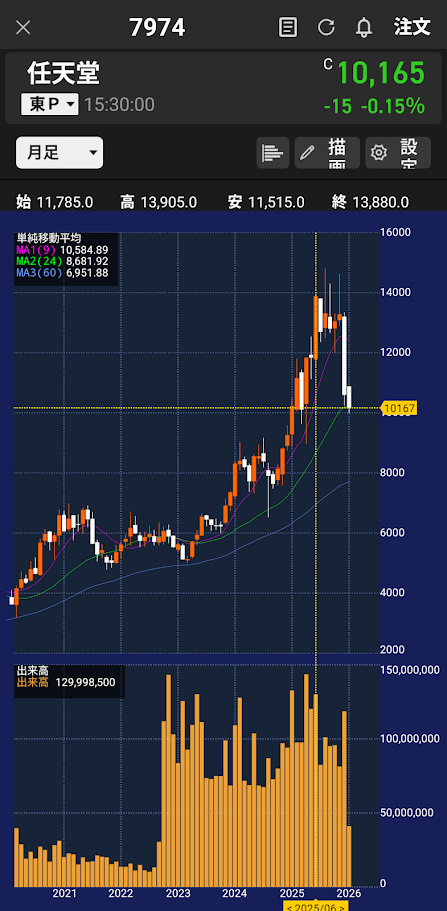 にもかかわらず株価は月足で大きく調整し、10,000円前後という“歴史的な押し目ゾーン”に突入。