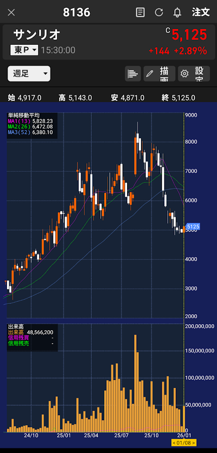サンリオの株価は直近で調整局面を迎えていましたが、足元ではチャートが下げ止まり、反転の兆しを見せています。