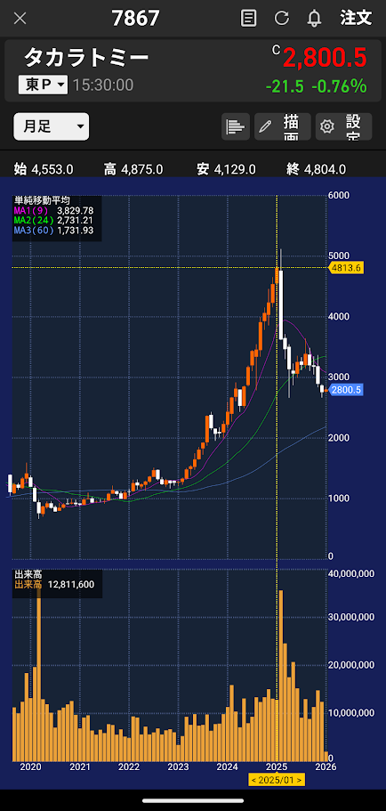 今日の注目銘柄は、誰もが知る玩具大手タカラトミー(7867)です。チャートを見て「おや?」と思った方も多いはず。実は今、テクニカル的にもファンダメンタル的にも、非常に面白い局面に来ています。