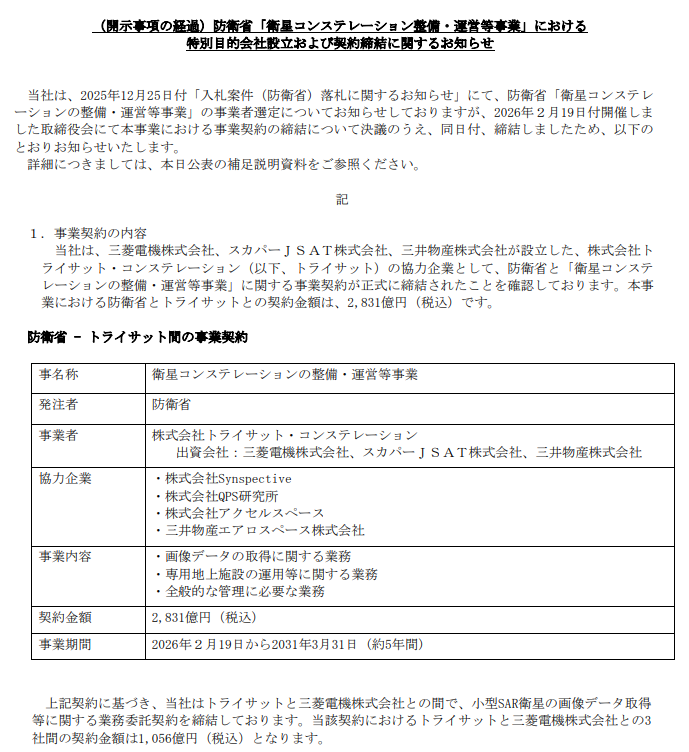 Synspectiveが防衛省と大型契約を締結したことが報じられた。